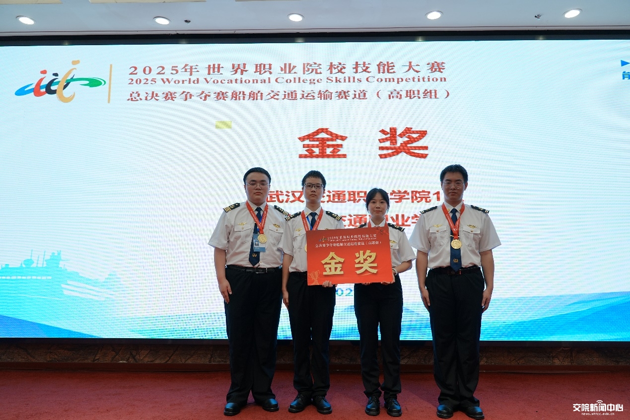 新闻网讯(通讯员 倪志斌)8月25日,2025年世界职业院校技能大赛船舶交通运输赛道(高职组)在武汉船舶职业技术学院圆满落幕,我校航运学院学生夏清涛、胡铭悦、方思能、张银波在吴飞、李志特老师的指导下斩获金奖,夺得今年我校参赛队伍中的“首金”。