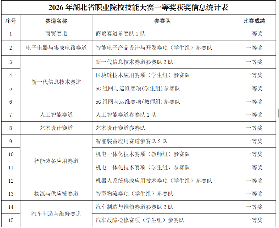 ▲2026年湖北省职业学院技能大赛一等奖获奖信息统计