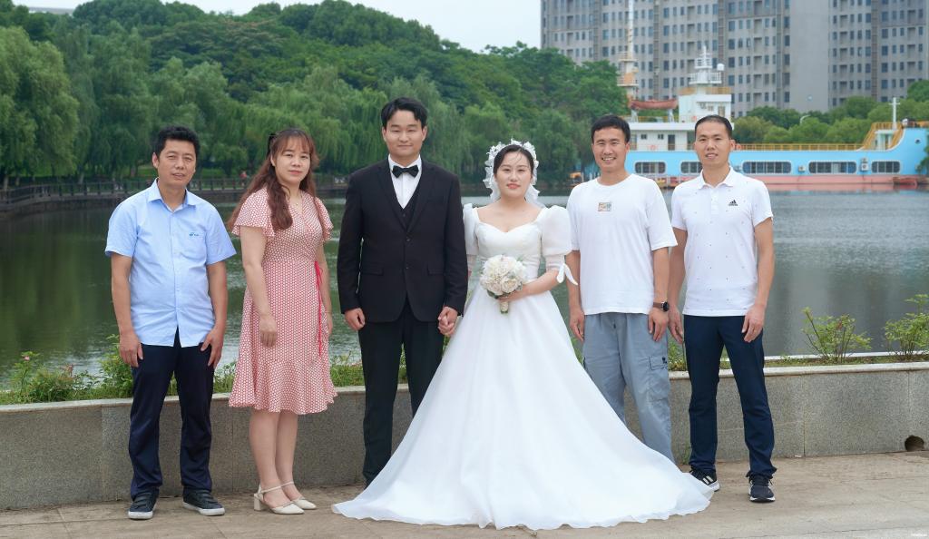 连心湖边合影 左起:新娘父亲、新郎辅导员胡群、新郎柯良愿、新娘袁微、新娘辅导员张理才、交通工程学院团总支书记郭新伟