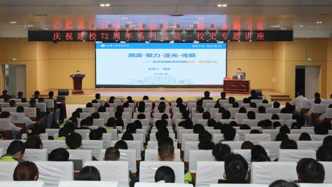 薪火承志 再续华章,11月21日下午,“溯源∙聚力∙逐光∙传薪——武汉交通职业学院的过去、现在与未来”校史专题讲座在尚能楼报告厅隆重举行。讲座特邀学校原党委书记、“双高计划” 专家咨询组专聘副组长杨震教授担任主讲嘉宾,副校长胡琴主持。杨震教授以详实的史料、生动的故事,回溯了学校 72 载砥砺前行的奋斗征程,深入阐释了“水韵”精神的内涵与传承。校友办公室、党委宣传部等部门负责人及师生代表、校友代表共计400余人现场聆听;校内各单位在集中活动时,专门邀请年长的教职工发言讲校史小故事,忆苦思甜,带领师生校友在回望历史中,凝聚起共谋发展的强大合力。